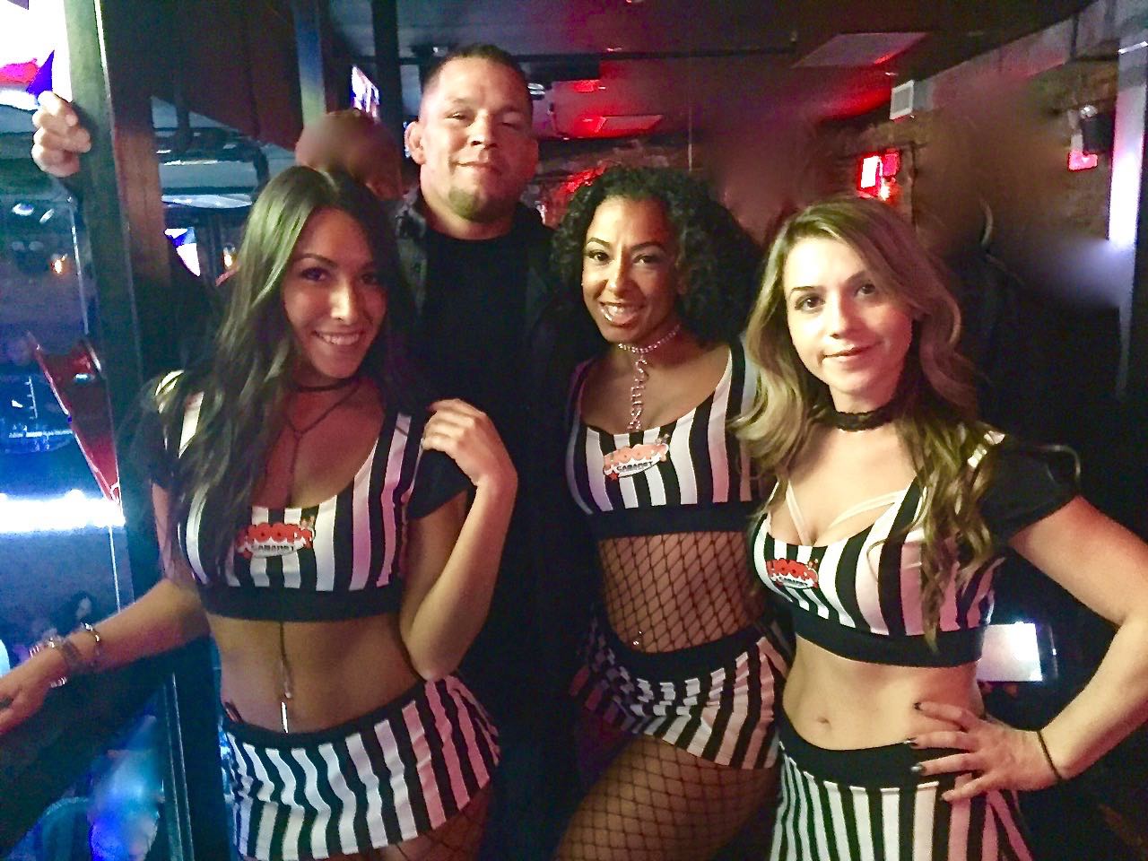 Nate Diaz looks happy posing with the Hoops Cabaret staff during a recent visit, and that’s a good enough reason for us to go check out the club and the girls.