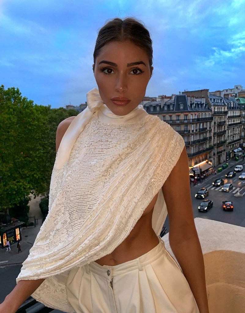 The 27-year-old model kicked off her trip to the City of Light on Wednesday in a Magda Butrym white sequin “Medford” cape ($1,315) with a bow at the neck, which she wore sideways without anything underneath. She paired her DIY top with “Totness” pants ($655) by the same designer.