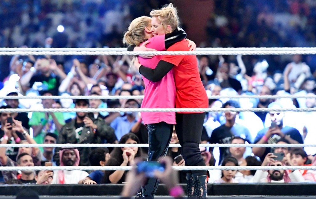 Wrestling superstars Natalya and Lacey Evans covered their skin with black leggings and baggy t-shirts — a stark contrast from their typical skimpy outfits when they faced off at the King Fahd Stadium in Riyadh Thursday.