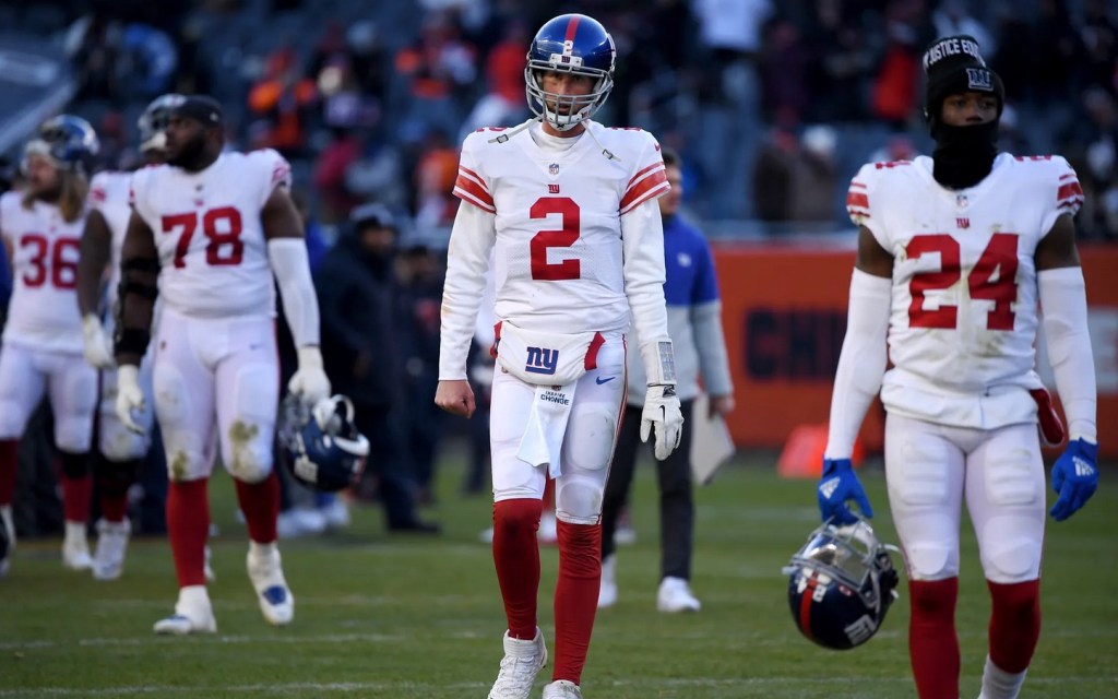 Giants QB Mike Glennon, who was filling in for starter Daniel Jones, who has a neck injury, completed 4 of 11 passes for 24 yards and the two interceptions and was sacked four times.