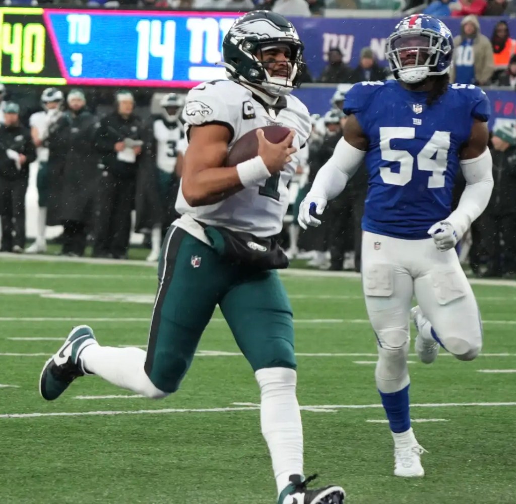 Quarterback Jalen Hurts once again played at an MVP level, throwing for 217 yards, rushing for 77, and accounting for three total touchdowns. Hurts became the first quarterback in NFL history with double-digit rushing touchdowns in back-to-back seasons. He also posted a 109.2 QB rating.