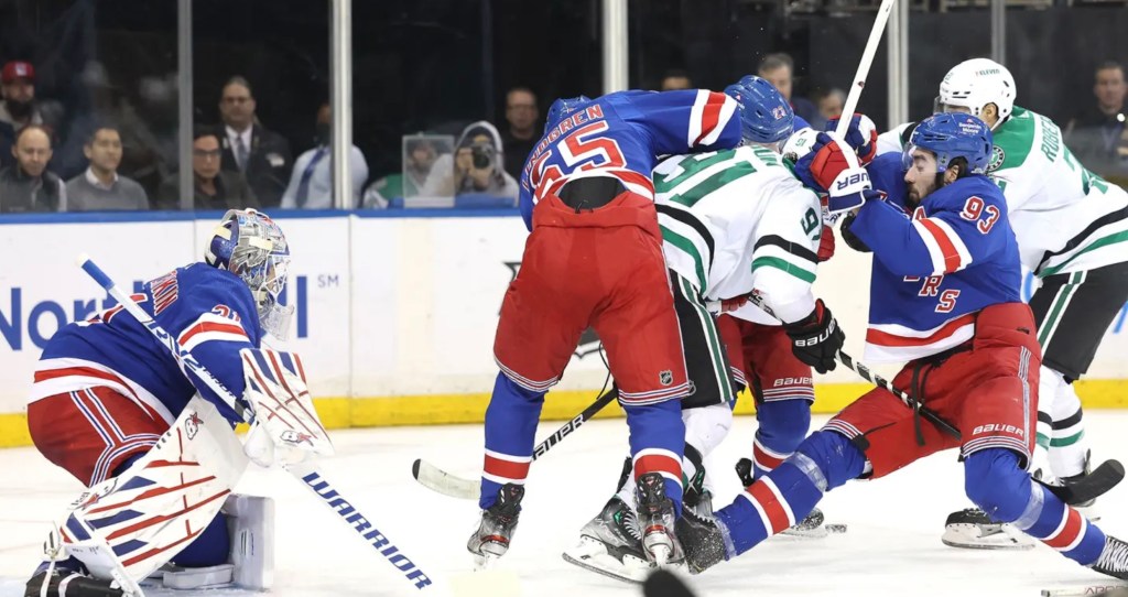 K’Andre Miller’s snap shot from the top of the circle beat Stars goalie Jake Oettinger with just 0.9 seconds left in regulation to send the Rangers to overtime. Just 1:16 of game time later, in the 3-on-3 extra session, Adam Fox deftly potted a backhander past Oettinger amid chaos in front of the Dallas goal, sealing a stunning 2-1 victory for the Blueshirts at The Garden on Thursday night.