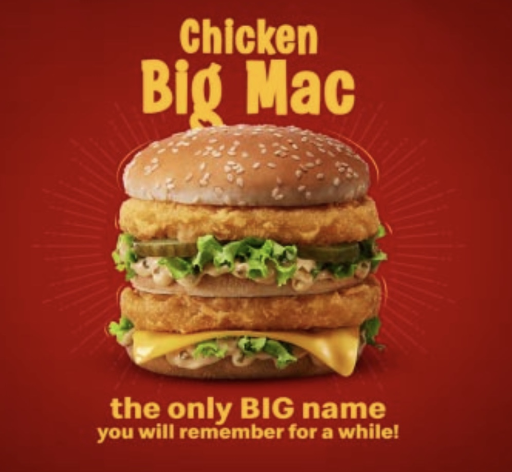 The Chicken Big Mac features two crispy chicken patties, Big Mac sauce, fresh lettuce, processed cheddar cheese, and tangy pickles on a freshly toasted sesame seed bun.