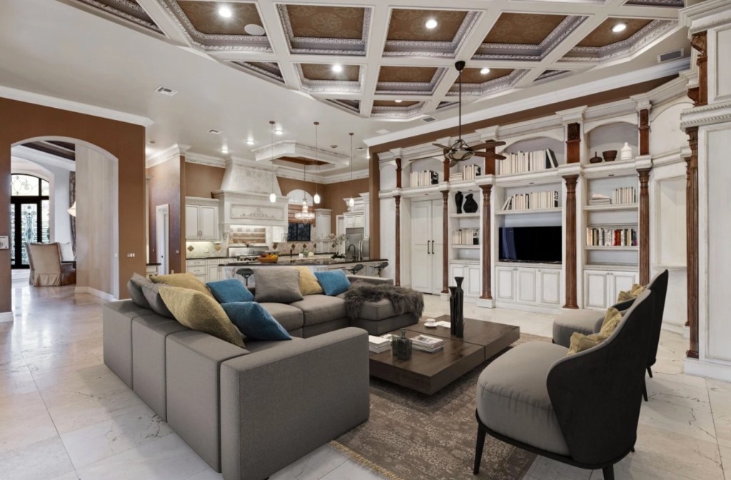 The four-bedroom, 5½-bathroom home features a chef’s kitchen, a “hidden” movie theater, a home office, an indoor bar area with a pool table and a yoga room.