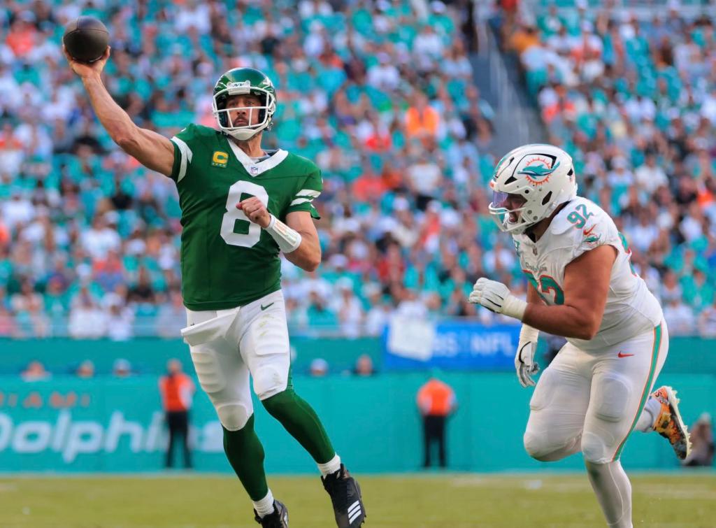Rodgers and the Jets nearly pulled off the win on Sunday in South Florida. They took a 23-15 lead into the fourth quarter, and took a three-point lead after Anders Carlson drilled a 42-yarder with 52 seconds left on the clock.