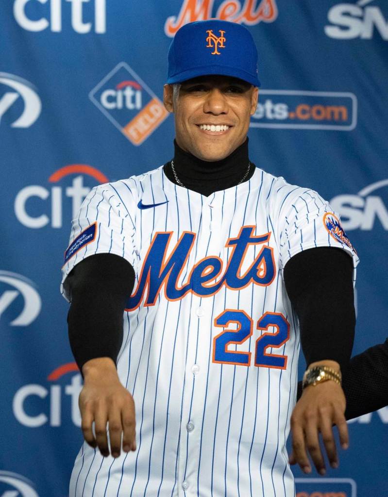 Juan Soto was introduced at Citi Field after his record $765 million, 15-year contract was finalized. He was flanked by Mets owner Steve Cohen, president of baseball operations David Stearns and agent Scott Boras.