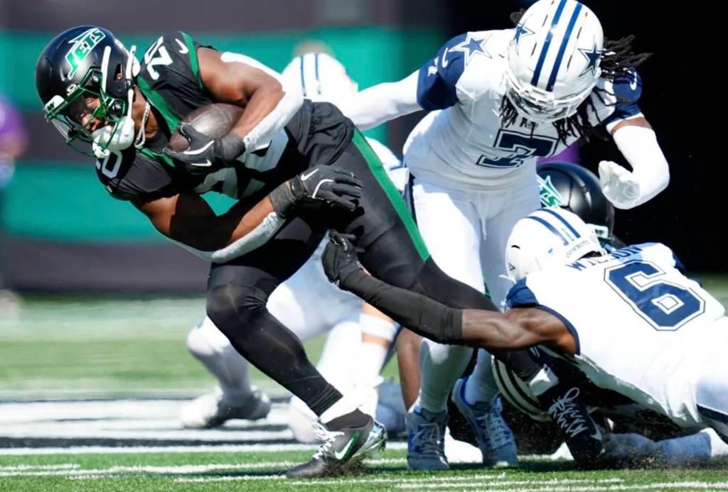Jets QB Justin Fields was sacked five times, Breece Hall fumbled away a key opportunity in the first half, and the Jets offense couldn’t convert on two fourth-and-1 plays, all adding up to a long afternoon in East Rutherford.