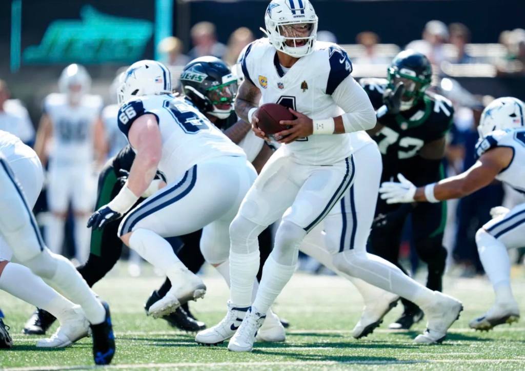 Justin Fields threw for 283 yards and two touchdowns while running for 26, and Breece Hall rushed for 113. Dak Prescott threw four touchdown passes to continue his MVP-like pace, and the Cowboys ran for 180 yards.